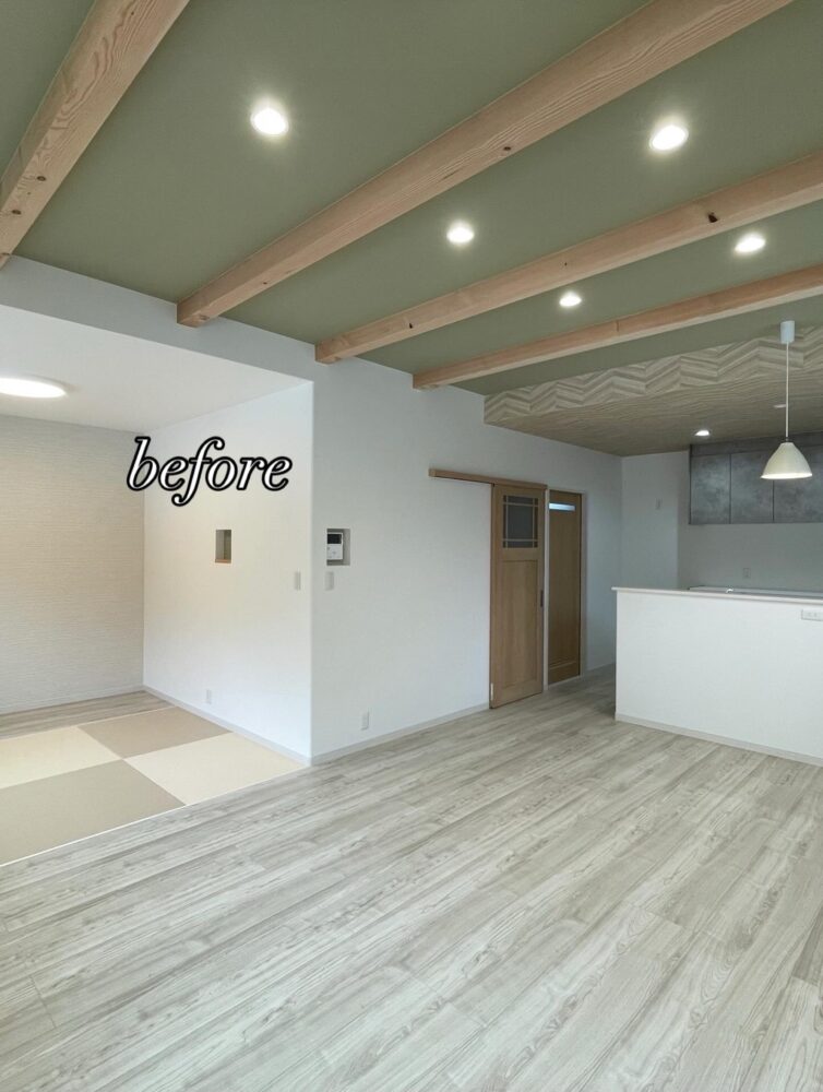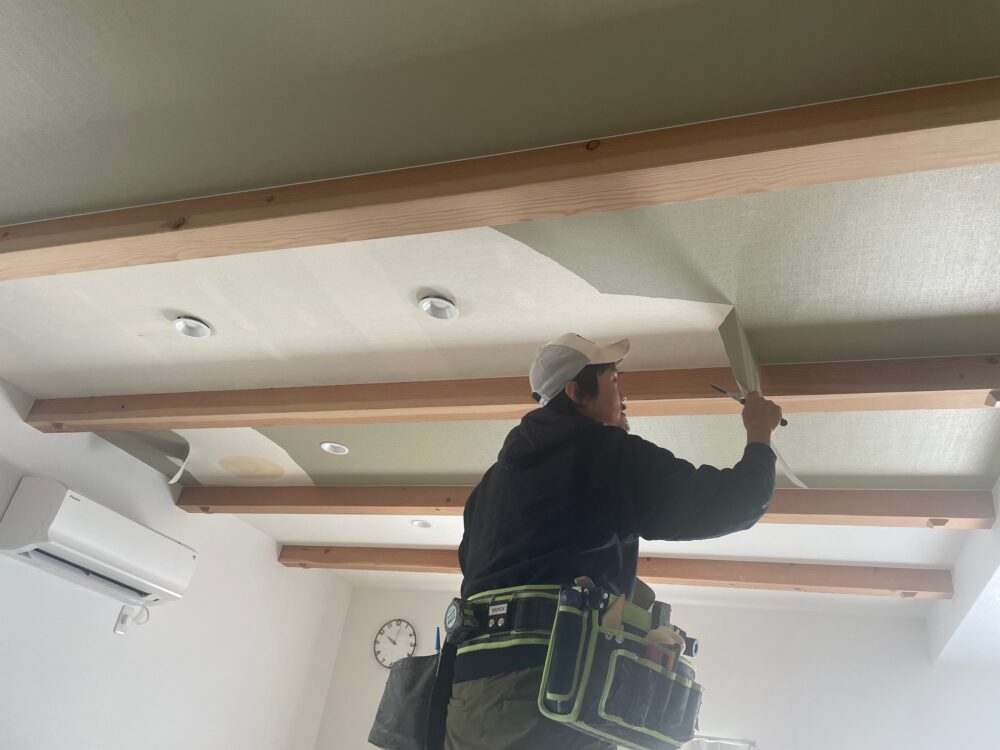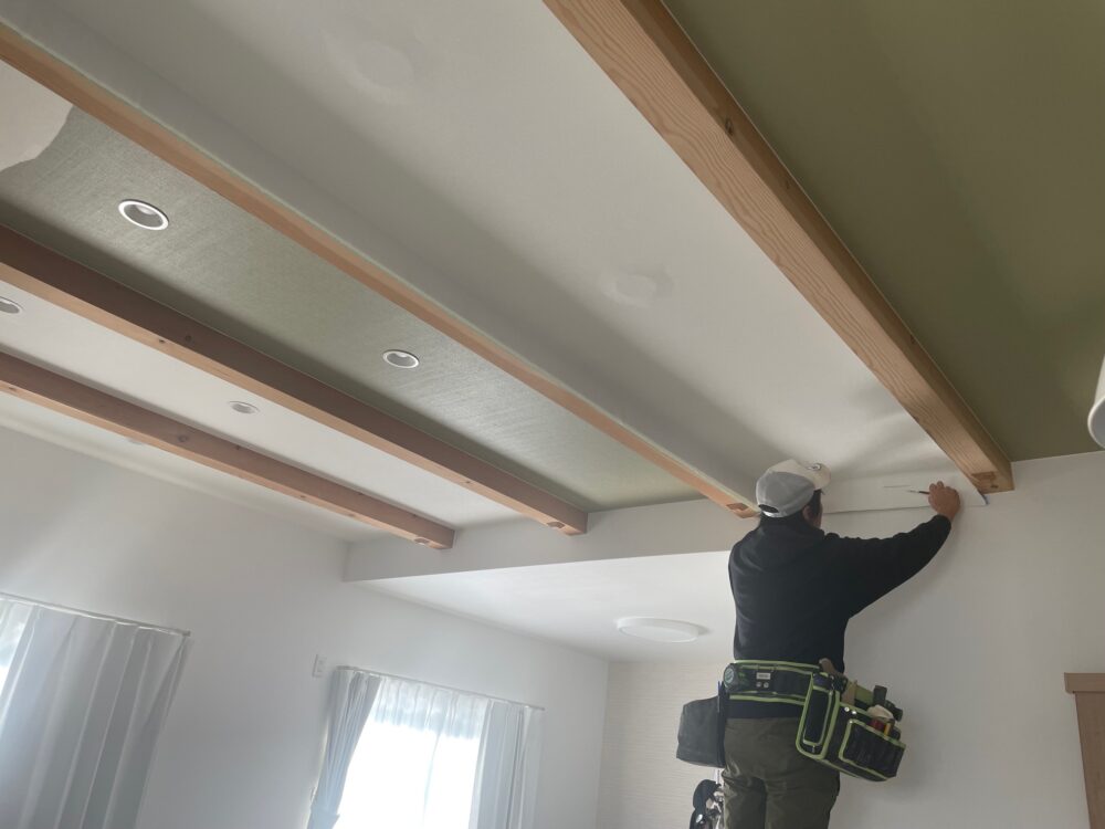 天井をアクセントに梁と緑の壁紙がいい雰囲気でしたが同じクロスが廃盤の為、全体を張り替えることになりました。